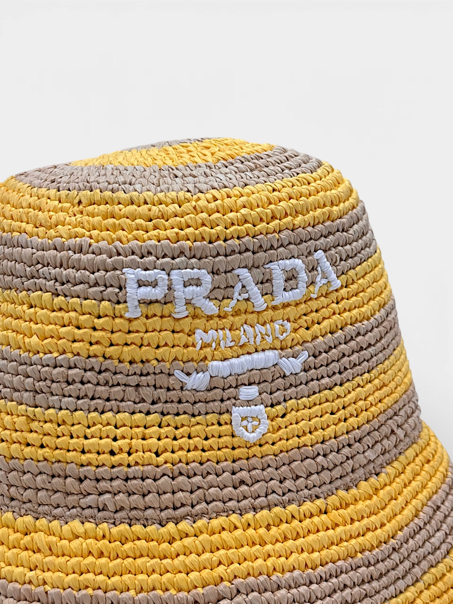 • Prada Logo Striped Raffia Bucket Hat
